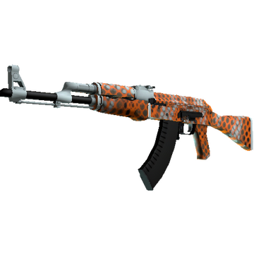 Powerful and reliable, the AK-47 is one of the most popular assault rifles in the world. It is most deadly in short, controlled bursts of fire. An orange mesh pattern has been applied over a white base.