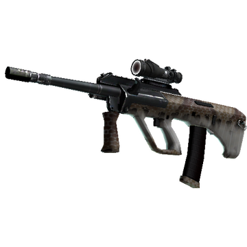 Powerful and accurate, the AUG scoped assault rifle compensates for its long reload times with low spread and a high rate of fire. It has been painted using a copperhead snakeskin-patterned hydrographic.
