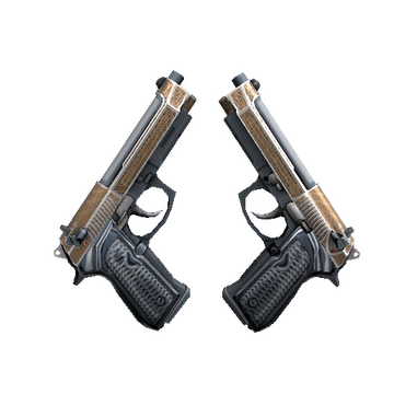 Firing two large-mag Berettas at once will lower accuracy and increase load times. On the bright side, you’ll get to fire two large-mag Berettas at once. Both Berettas have been hand etched using a wave pattern. The slides have been painted gold.