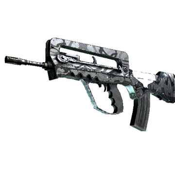A cheap option for cash-strapped players, the FAMAS effectively fills the niche between more expensive rifles and the less-effective SMGs. It has been painted in an aquatic-stripe pattern with charcoal metallic paints of various reflectivities over a chrome base coat.
