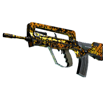 A cheap option for cash-strapped players, the FAMAS effectively fills the niche between more expensive rifles and the less-effective SMGs. It has been painted with a pattern of nuclear hazard symbols using metallic paints.