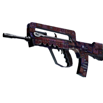 A cheap option for cash-strapped players, the FAMAS effectively fills the niche between more expensive rifles and the less-effective SMGs. It has been custom painted with pink interlocking squares. The squares are painted with lifelike eyes.