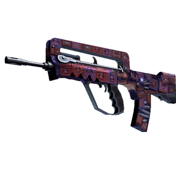 A cheap option for cash-strapped players, the FAMAS effectively fills the niche between more expensive rifles and the less-effective SMGs. It has been custom painted with pink interlocking squares. The squares are painted with lifelike eyes.