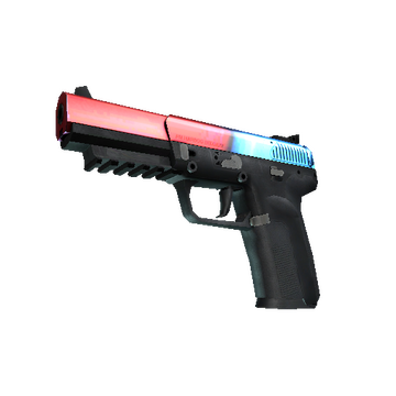 Highly accurate and armor-piercing, the pricy Five-Seven is a slow-loader that compensates with a generous 20-round magazine and forgiving recoil. The slide has been painted half red and half blue.