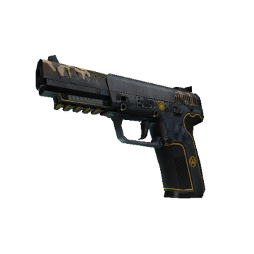 Highly accurate and armor-piercing, the pricy Five-Seven is a slow-loader that compensates with a generous 20-round magazine and forgiving recoil. It has been custom painted with camo patterns and a CT beneath the rear sight.