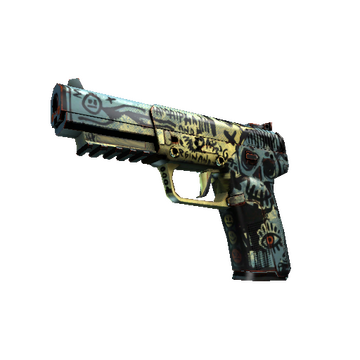 Highly accurate and armor-piercing, the pricy Five-Seven is a slow-loader that compensates with a generous 20-round magazine and forgiving recoil. Custom designs have been hand-painted using bold strokes over a yellow and teal base.
