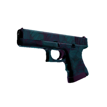 The Glock 18 is a serviceable first-round pistol that works best against unarmored opponents and is capable of firing three-round bursts. A teal and purple hydrographic pattern of overlapping leaves has been applied.