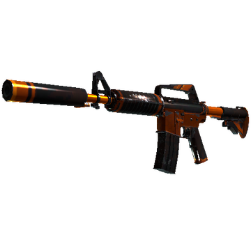 With a smaller magazine than its unmuffled counterpart, the silenced M4A1 provides quieter shots with less recoil and better accuracy. It has been anodized black and orange.
