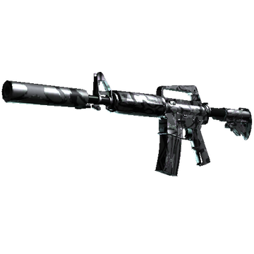 With a smaller magazine than its unmuffled counterpart, the silenced M4A1 provides quieter shots with less recoil and better accuracy. It has been painted in an aquatic-stripe pattern with charcoal metallic paints of various reflectivities over a chrome base coat.
