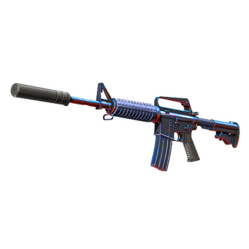 With a smaller magazine than its unmuffled counterpart, the silenced M4A1 provides quieter shots with less recoil and better accuracy. Its dark base and carefully selected red and blue highlights make this custom painted M4A1-S appear as if it’s glowing under ambient light.