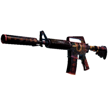 With a smaller magazine than its unmuffled counterpart, the silenced M4A1 provides quieter shots with less recoil and better accuracy. This custom paint job features ancient iconography and a golden pit viper before a dusk-tinted jungle background.