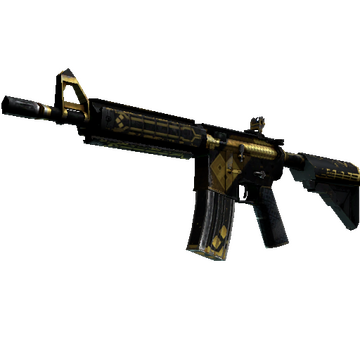 More accurate but less damaging than its AK-47 counterpart, the M4A4 is the full-auto assault rifle of choice for CTs. A custom gold and black paint job with interlocking triangles and blue highlights has been applied.
