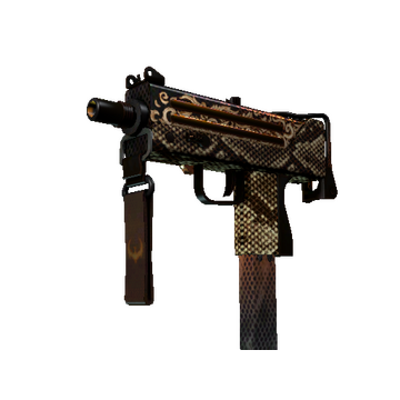 Essentially a box that bullets come out of, the MAC-10 SMG boasts a high rate of fire, with poor spread accuracy and high recoil as trade-offs. It has been custom painted with a bronze snakeskin pattern and a coiled snake beneath the wire form butt.